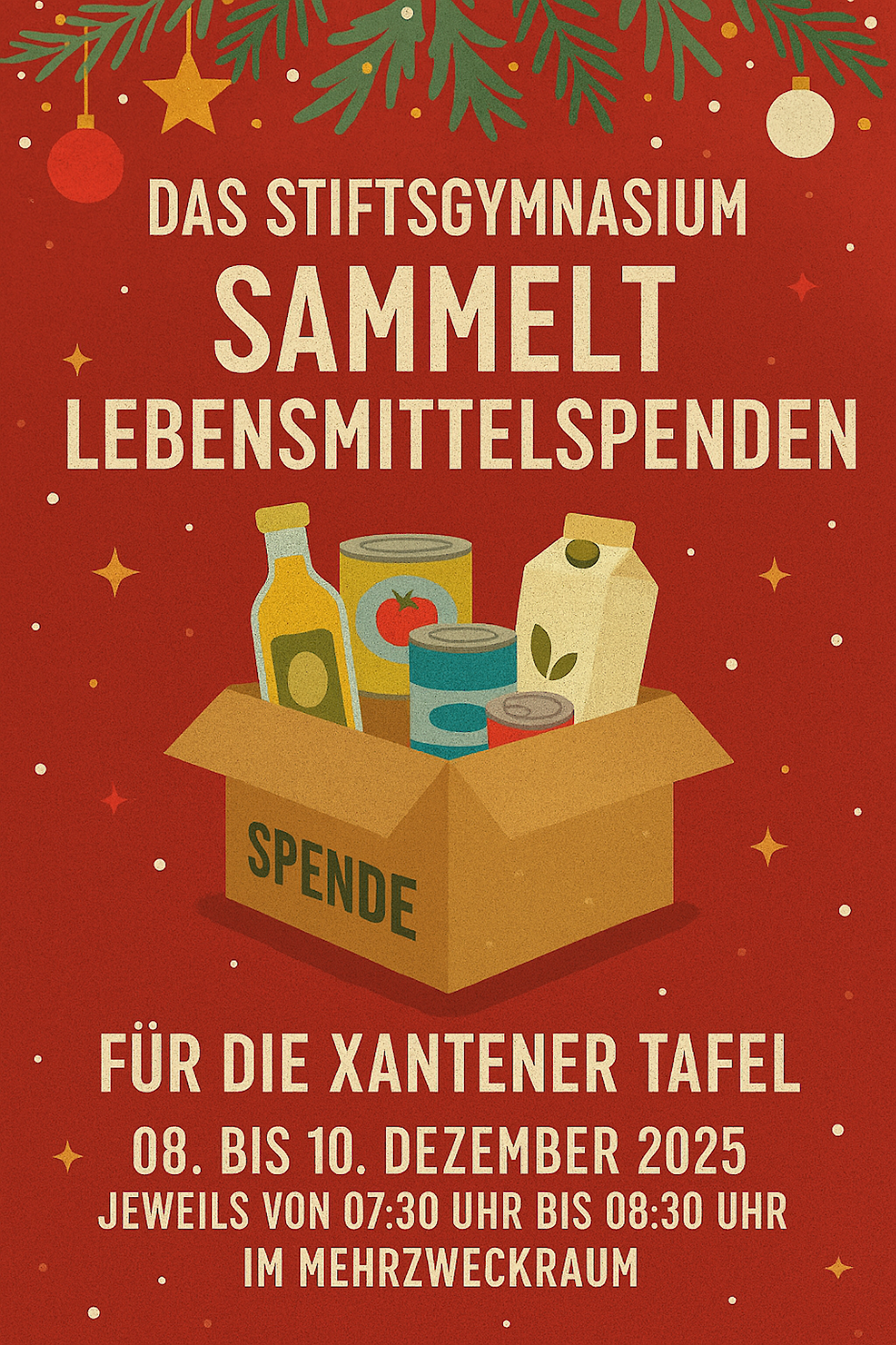 Von Montag, 08. Dezember bis Mittwoch, 10. Dezember 2025 sammeln Mitarbeiterinnen und Mitarbeiter der Xantener Tafel jeweils von 07:30 Uhr bis 08:30 Uhr im MEHRZWECKRAUM der Schule Lebensmittelspenden, die von zuhause mitgebracht werden.