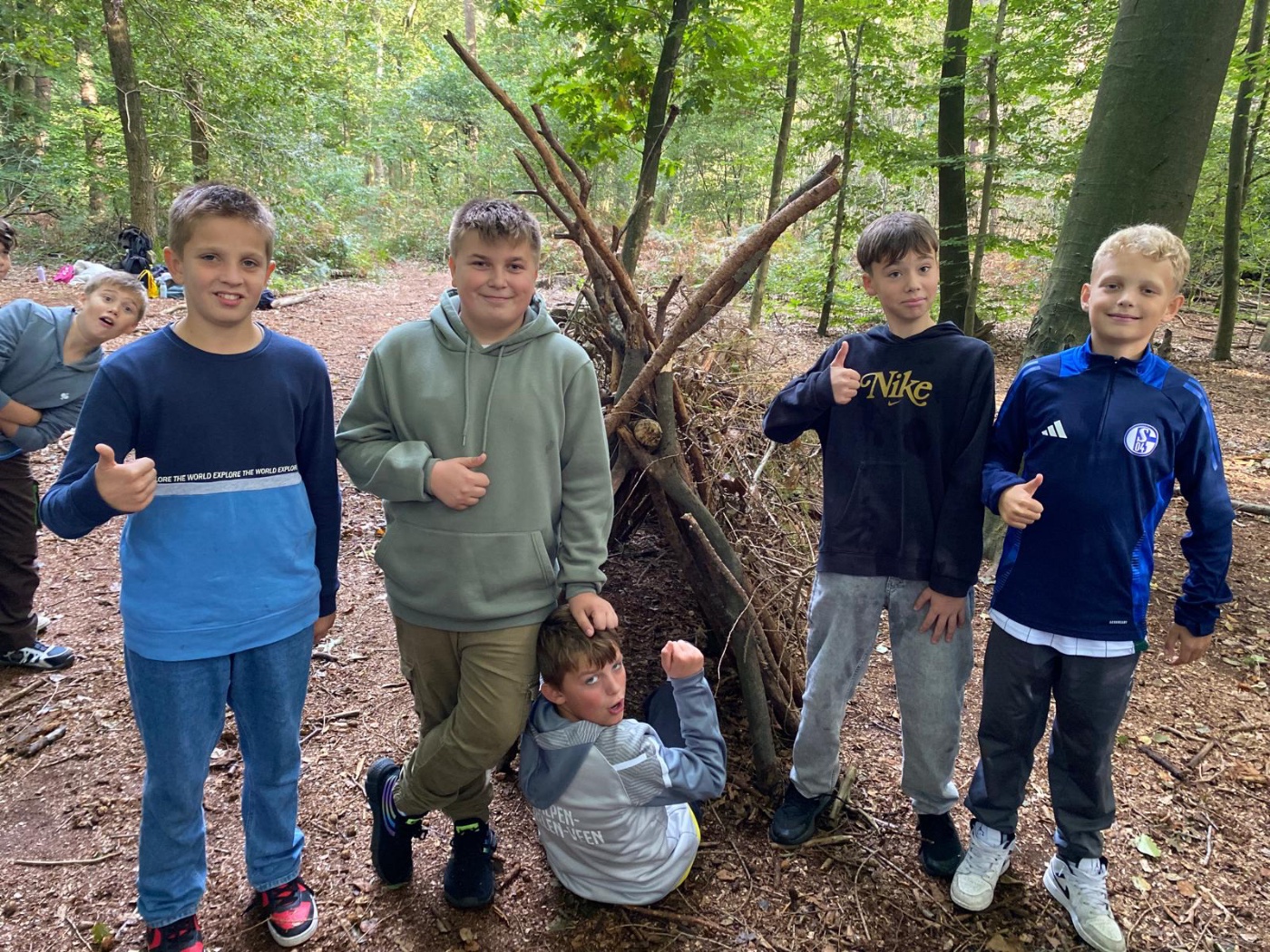 Für 107 Schülerinnen und Schüler startete eine spannende Woche zunächst mit einer dreitätigen Klassenfahrt zum Wolfsberg nach Kleve. Bei bestem Wetter sollten unter Anleitung von Naturguide Waldemar und seinem Team im Wald Schutzhütten entstehen, in Gruppen wurde gemeinsam geplant, gesammelt und erfolgreich gebaut. Auch beim Feuermachen mit Feuerstein und Reisig wurde Zusammenarbeit und Geduld am Ende bei allen belohnt, der Jubel war groß, als die ersten Flammen zu sehen waren.