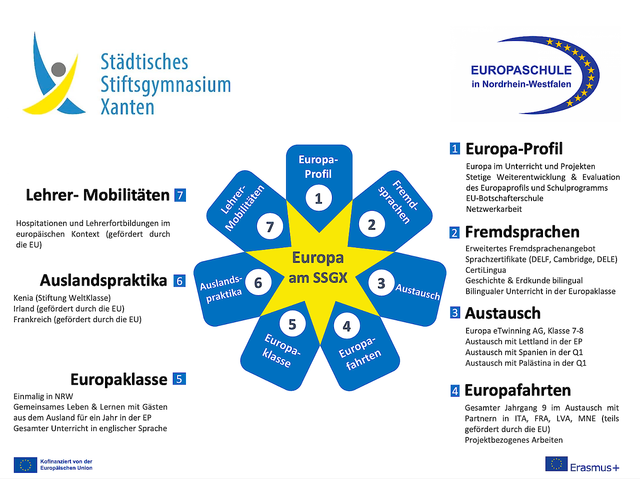 Dies geschieht zum Beispiel in unserer internationalen Europaklasse in der Einführungsphase (EF), die in dieser Form einmalig in NRW ist. Außerdem tragen die Europa-Austausche der Jahrgangsstufe 9, bei denen der gesamte Jahrgang im Rahmen unserer Programmwoche in Europa unterwegs ist, dazu bei.