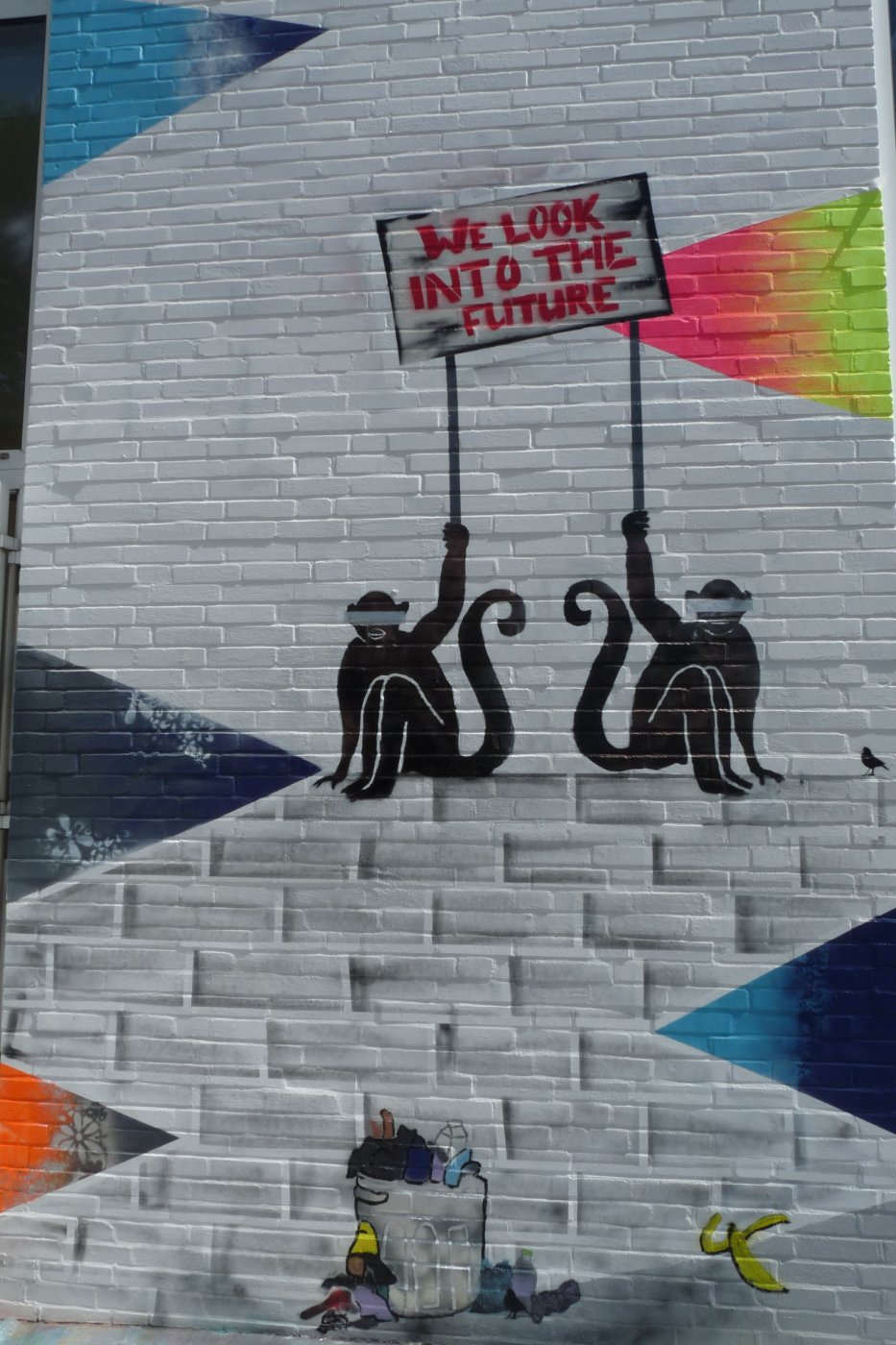 Unter dem Leitspruch „Kreativ gegen Mauern – Banksy bewegt“, ließen sich die 16- und 17-jährigen palästinensischen und deutschen Schüler vom britischen Street-Art Künstler Banksy inspirieren. Die Woche begann mit einem Austausch über das bereits vorhandene Wissen über Banksy und seine Kunst. Gemeinsam sprachen die insgesamt 24 Schüler über einige Graffitis, die die Palästinenser im Original aus ihrer Heimatstadt gut kannten. Am nächsten Tag konnte man sich in der Banksy Ausstellung MOCO weitere Eindrücke verschaffen. Dieser Besuch in Amsterdam war für Palästinenser und Deutsche gleichermaßen spannend. Denn dort wurden einige kulturelle Unterschiede nochmal deutlicher als am Tag zuvor. Vieles war für die palästinensische Gruppe neu. So erwartete beispielsweise keiner der deutschen Schüler, dass zwei Palästinenser erst einmal nicht am Treffpunkt pünktlich auftauchten; so groß war ihre Freude über die Möglichkeit sich ohne Mauern in einer Stadt frei bewegen zu können.